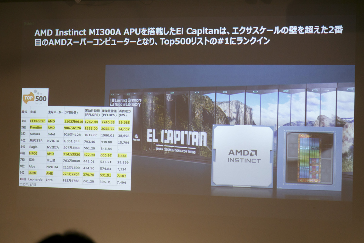 続いての2025年のトピックは、年に2回更新されるスーパーコンピューターランキングについて。11月に更新された最新ランキングで、AMD勢が1位、2位、6位、9位にランクインされた話題を紹介した。