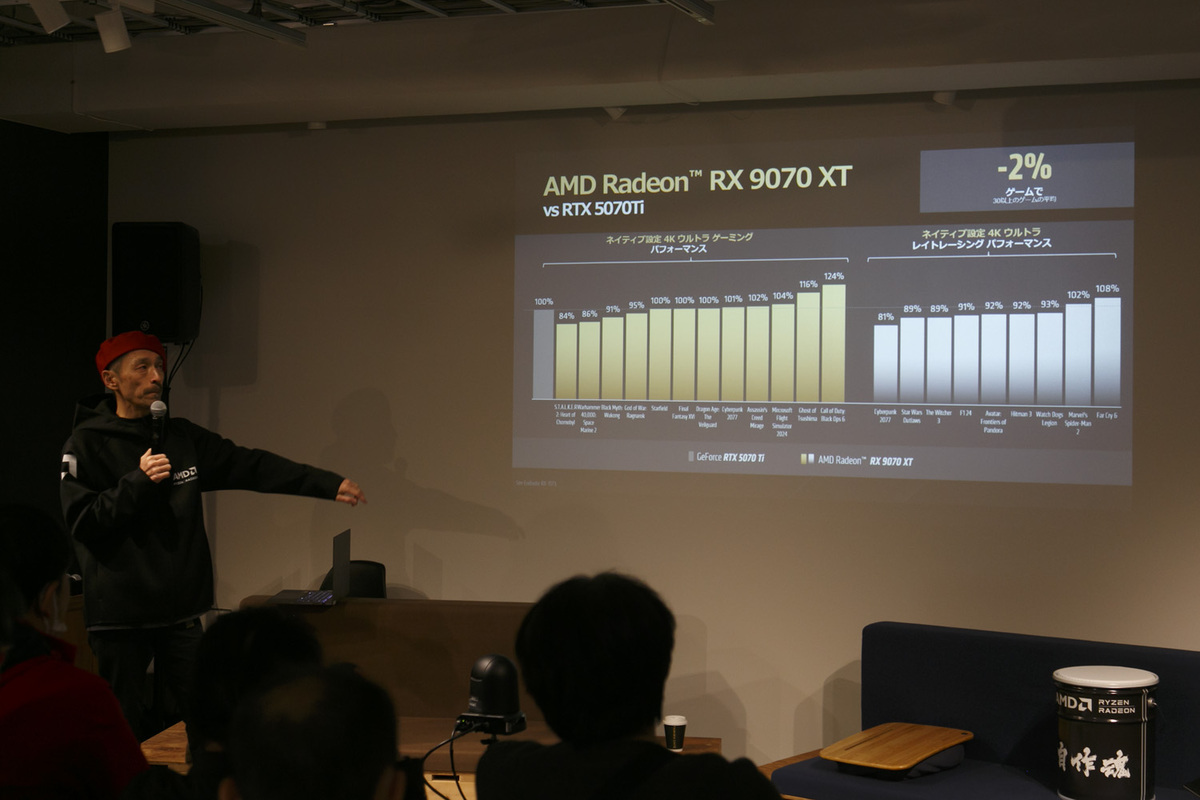 3月に発売した「Radeon RX 9070」と「Radeon RX 9070 XT」は、競合の「GeForce RTX 5070 Ti」と比べて、ほとんど差がないどころか一部では勝っている。佐藤氏は「パフォーマンスは同じでも価格は安い。その結果、いまRadeon 9000シリーズが多くのゲーマーに選ばれ、大ヒット製品になった」と分析した。