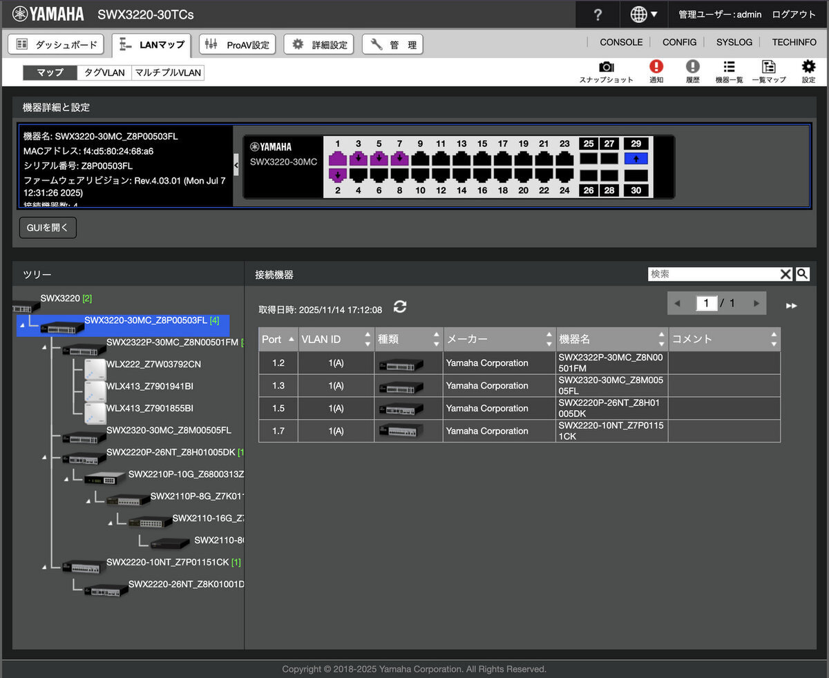 2025年12月のファームウェアでスイッチも、いよいよYNOに対応。クラウドでのネットワークの管理性がさらに向上する(関連記事:ヤマハ、新クラウド対応スイッチ4モデル発表 ルーター不要でYNOから直接管理可能に)。まずはGUIによる拠点にある機器設定(GUI Forwarder)とファームウェアの一括更新機能がサポートされる。