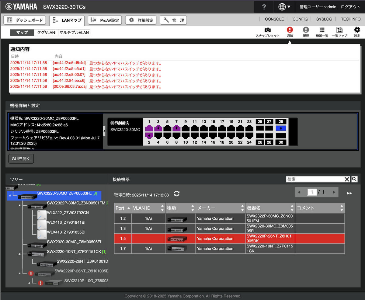 これに対して、ヤマハのスイッチはネットワークの可視化を実現する「LANマップ」が標準機能として提供されている。これがなにしろ強力。LANマップではヤマハのネットワーク機器の設定や異常確認を行なえるではなく、接続されているデバイスまで可視化できる。機器の検索も可能なので、対応が必要なスイッチやデバイスをいち早く見つけられる。
