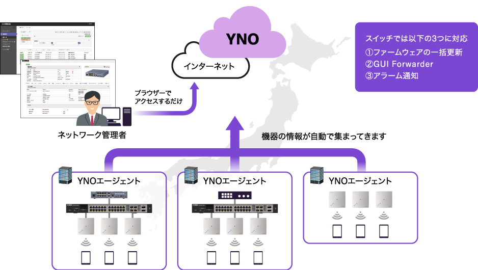 こうした課題を持ったネットワーク管理者にお勧めなのが、ヤマハのクラウド型ネットワーク管理サービス「YNO(Yamaha Network Organizer)」である。YNOを利用すれば、別途遠隔保守用のネットワークや管理サーバーの構築不要で、クラウドから遠隔にあるヤマハのネットワーク機器を管理できる。