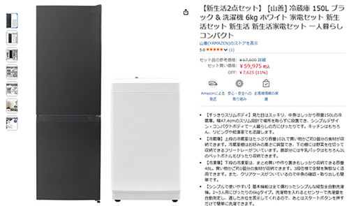 山善の新生活向け家電セット「冷蔵庫150L(ブラック)と洗濯機6kg(ホワイト)」が、Amazonセールに登場しました。セット品の参考価格67,600円のところ、11%オフの59,975円で購入可能です。