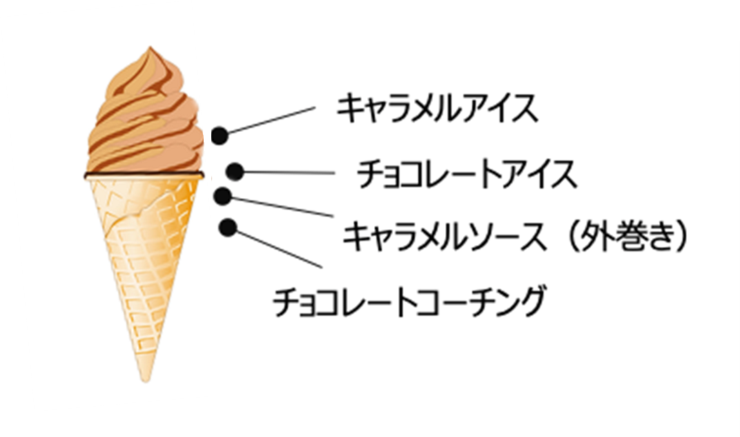 生クリームとブラウンシュガーを配合したキャラメルアイスとチョコレートアイスを2色巻きにし、キャラメルソースを外側にかけています。