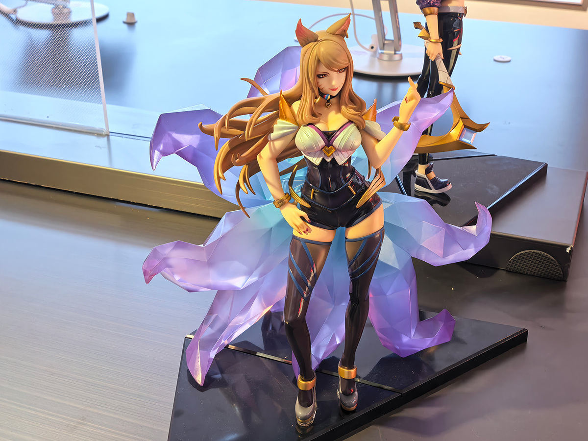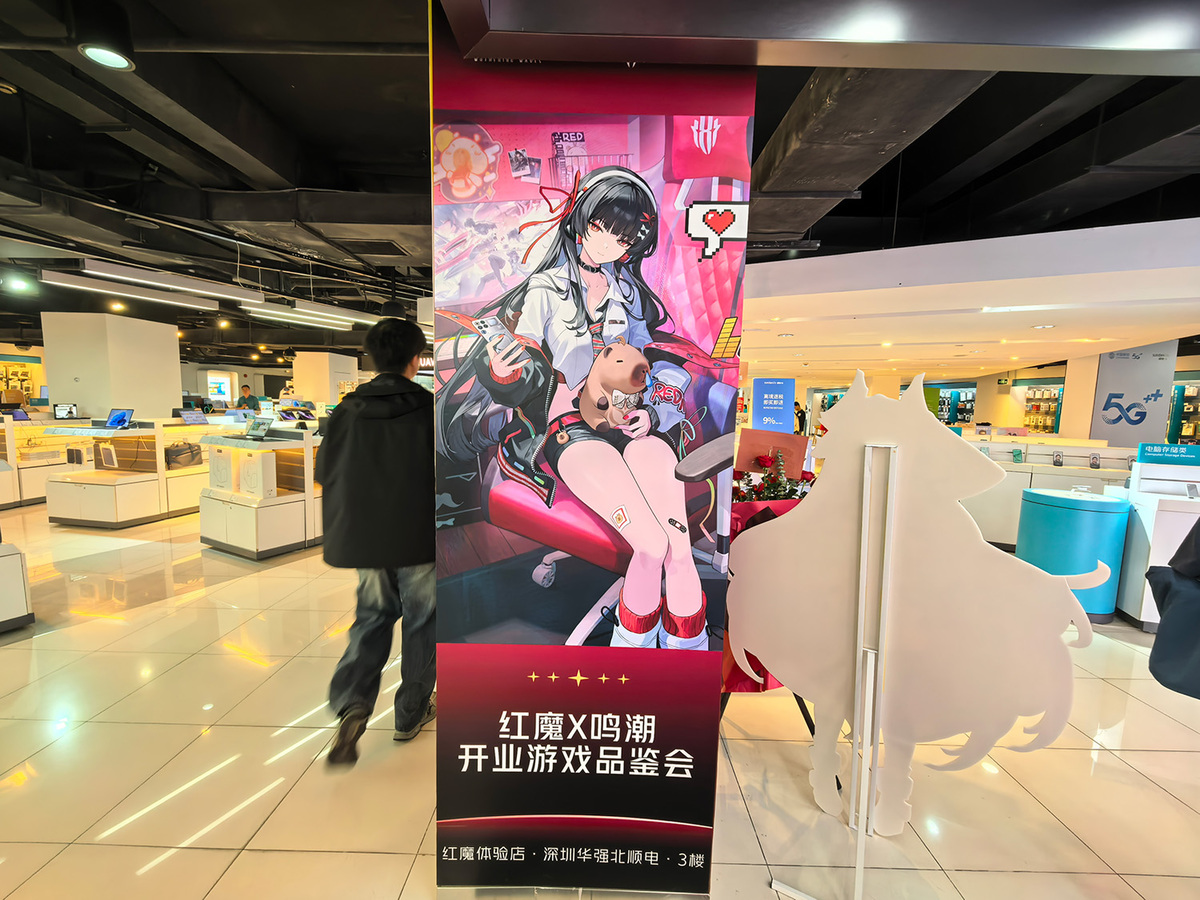 ところで先ほどのテーブルの上に、なにやらゲームのキャラなどが見えますが、12月にストアを訪問したところ、ちょうど鳴潮(めいちょう)とのコラボイベントを行なっていました。端末の展示だけではなくゲームとコラボするなど、ゲーミングスマートフォンのストアらしいイベントも開催されています。
