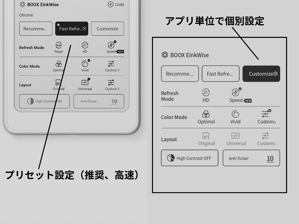 とくにカラー電子ペーパーは表示情報が多いため、白黒電子ペーパーよりほんの少し反応がゆっくり感じられることもあります。ただし「読書中心の端末」として使う範囲であれば問題はなく、設定で「高速」を選択すれば、そこまで気になるほどではないと個人的に感じました。