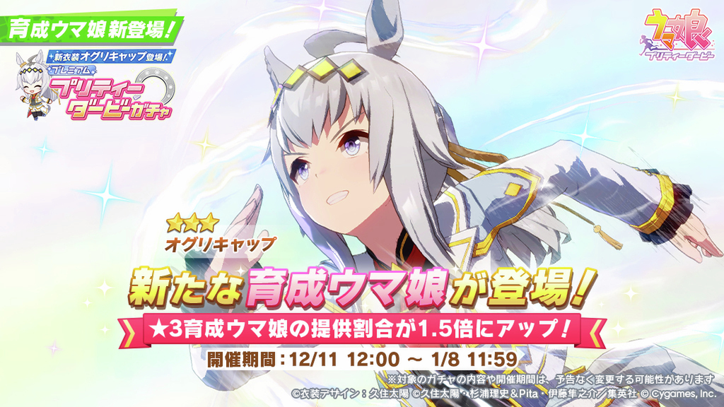Cygamesは12月10日、ゲーム「ウマ娘 プリティーダービー」にて新衣装の★3育成ウマ娘「[シンデレラグレイ]オグリキャップ」が登場するガチャを開催した。期間は1月8日まで。