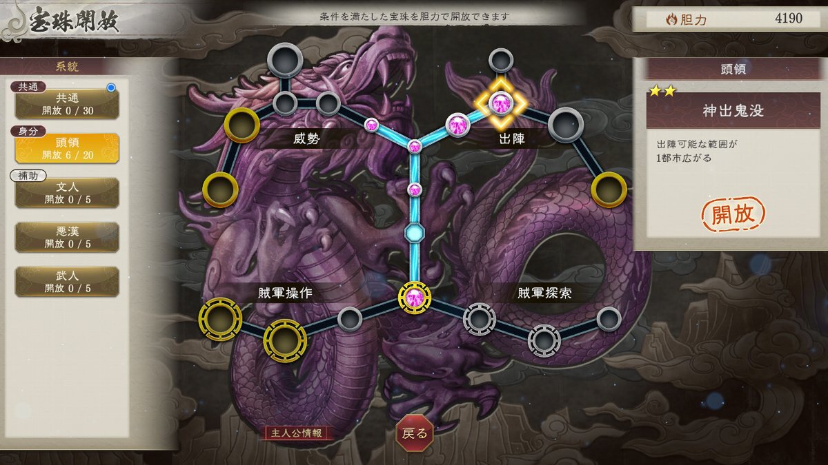また、「威勢」を高めると専用の強力な「宝珠」も獲得可能。例えば、離れた都市に出陣できる「神出鬼没」、一気に複数の都市へ賊を呼び出すことができる「賊軍扇動」などがある。