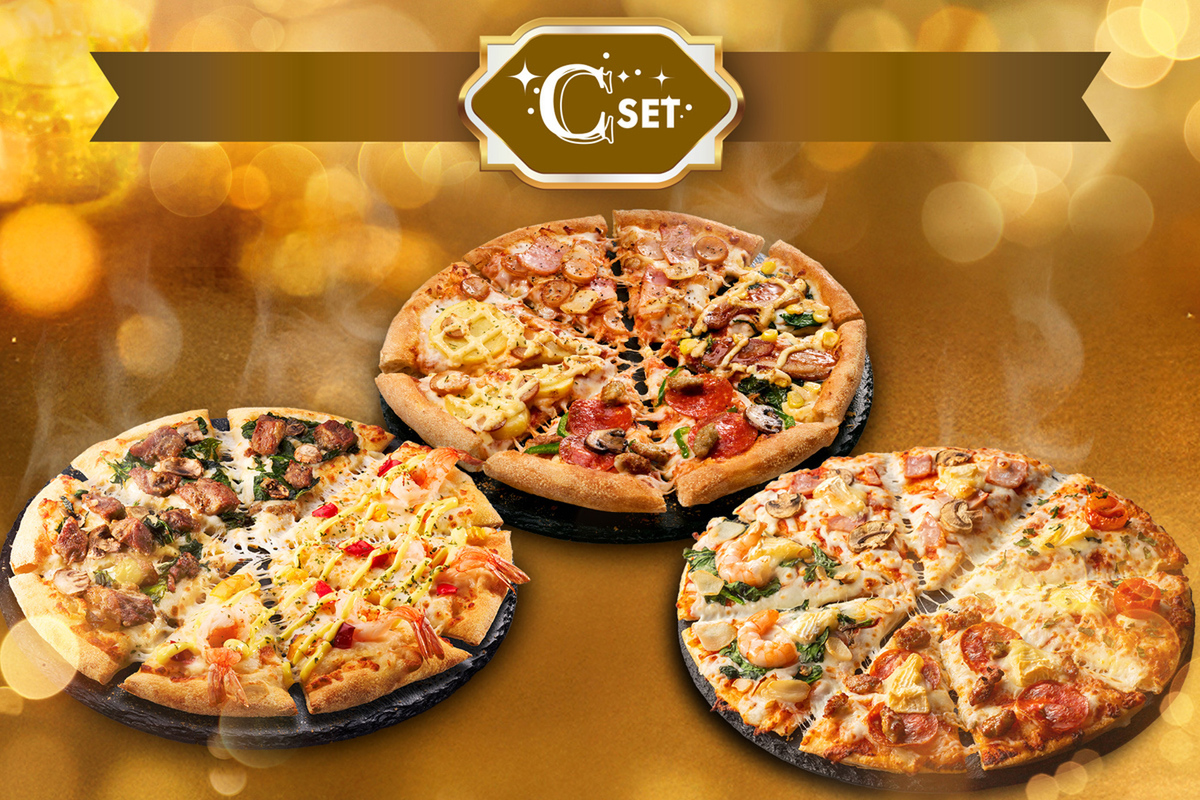 ピザ3枚を選べるセットです。大人数で集まる場面に向けて、ピザを中心に食卓を整えたい場合に利用できます。