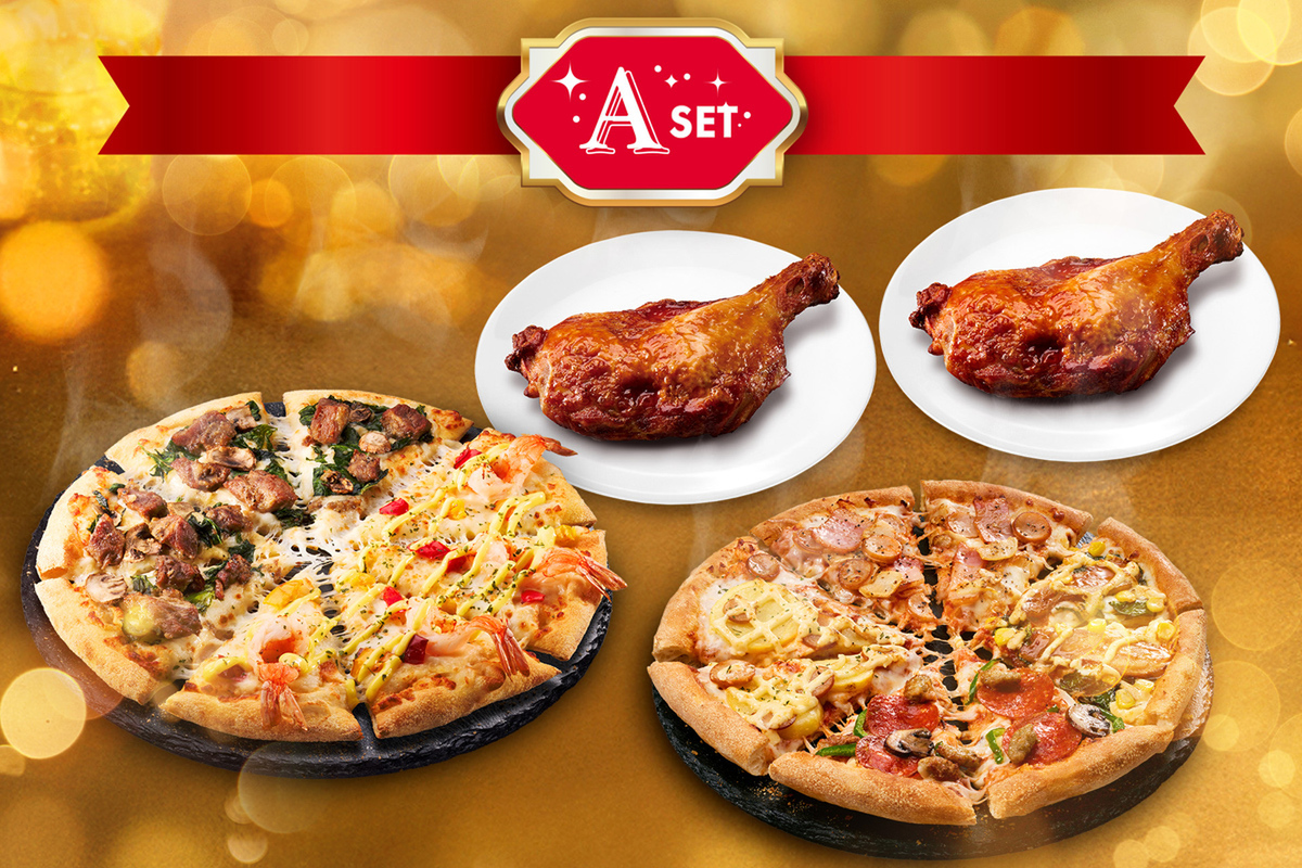 ピザ2枚とプレミアムローストチキン2本を組み合わせたセットです。家族や恋人との食事に使いやすい構成で、ピザとチキンをそろえて準備できます。