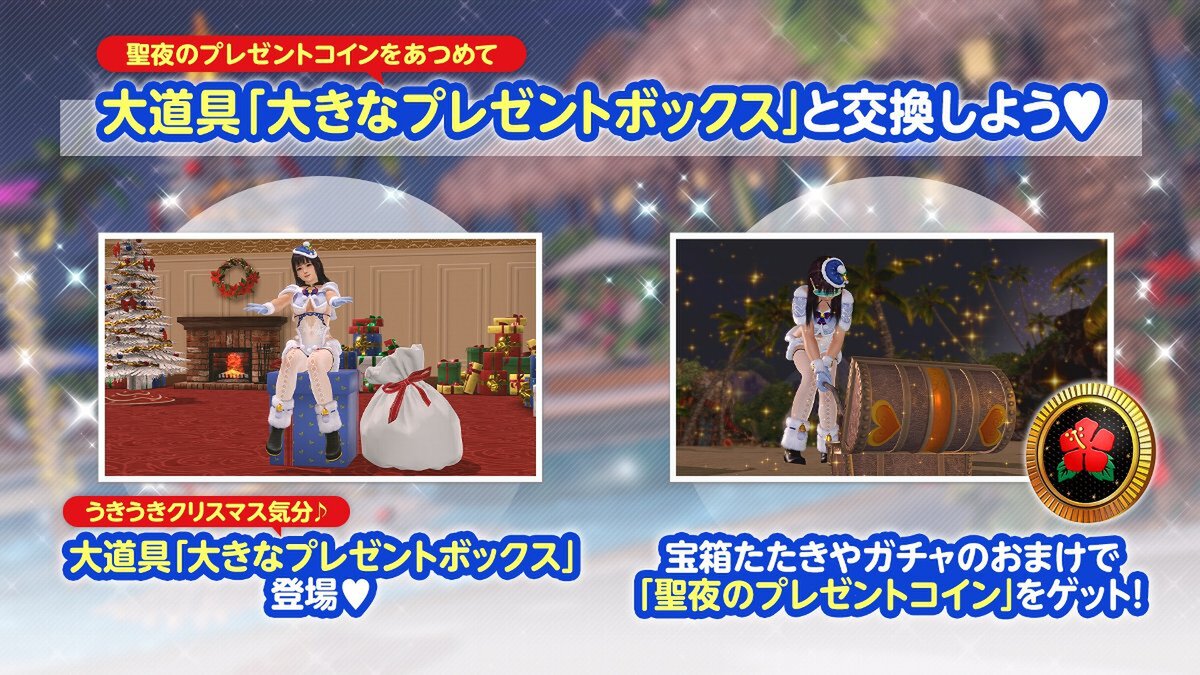 新イベント「雪降る聖夜のプレゼント」が開始。「クリスマス宝箱EX(プラチナ)」を使用した宝箱たたきやトレンドコーデガチャのおまけなどで入手できる「聖夜のプレゼントコイン」を集めて、新規追加の『大道具「大きなプレゼントボックス」うきうきで座る』を手に入れよう。