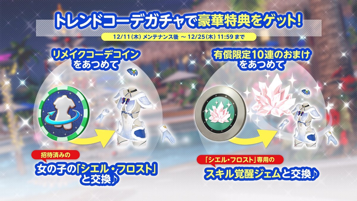 SSR「シエル・フロスト」の最大覚醒を条件としたミッションを達成すると、1着につきプレゼントアイテム「永遠のきらめく天然石」を2個入手できる(3着最大覚醒で最大6個まで入手可能)。