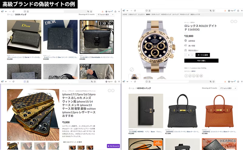 ・高級ブランドも主要な標的対象:コーチ、ディオール、グッチ、ロレックス、ラルフローレンなどのハンドバッグやスニーカー、限定品の偽オンラインストアが45%増加し、ブランドの画像が使用されたり、ホリデープロモーションと書かれたりしています。
