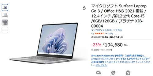 マイクロソフトのモバイルノートPC「Surface Laptop Go 3(8GB/128GB)プラチナ XJB-00004」が、Amazonセールに登場しました。参考価格135,080円のところ、23%オフの104,680円という魅力的な価格となっています。