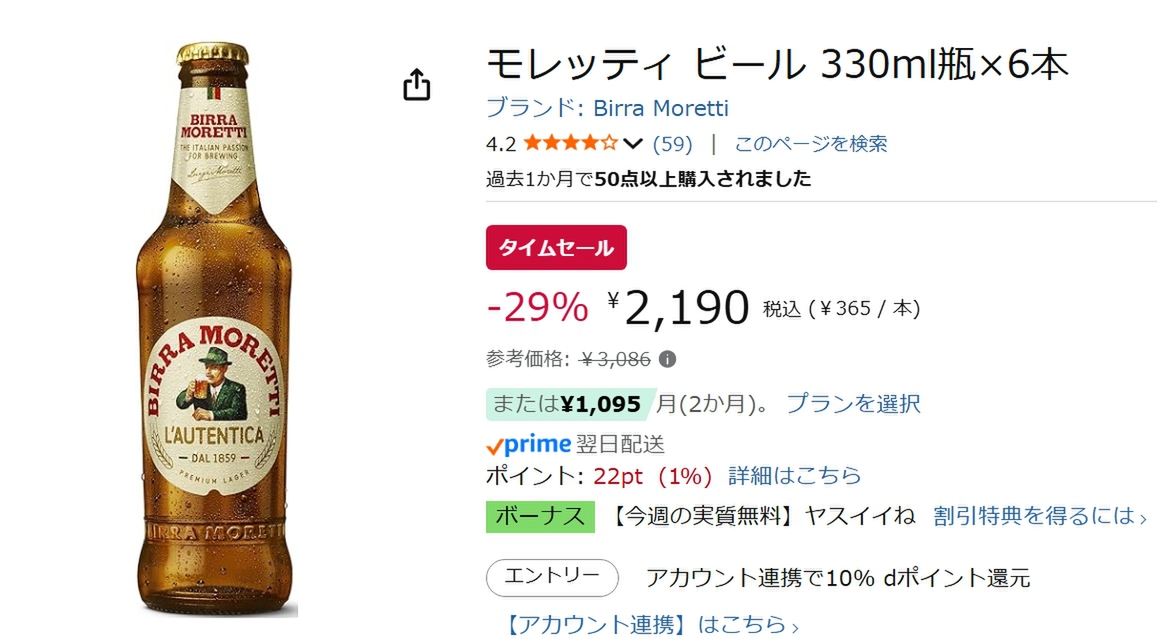 現在開催中のAmazonタイムセールで、モレッティ ビールの6本セットが数量限定で割引価格になっています。