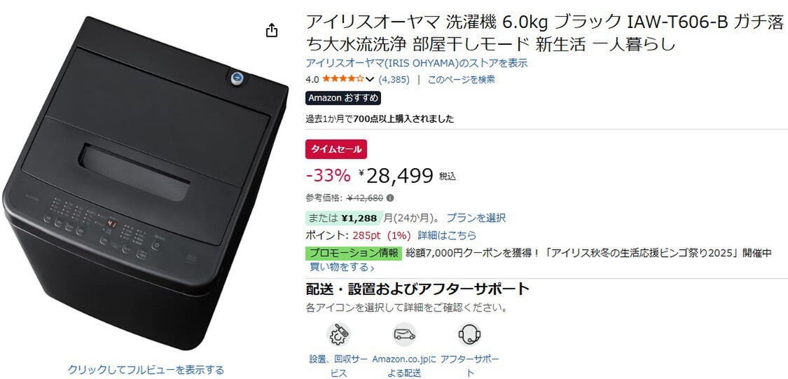 「アイリスオーヤマ洗濯機」の参考価格は42,680円ですが、タイムセールでは33%オフの28,499円という大幅割引価格で手に入ります。