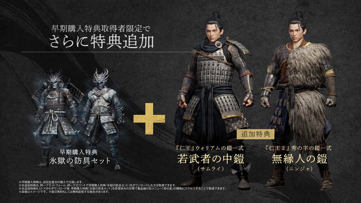 早期購入特典取得者限定で入手できる追加特典を発表した。追加特典では『仁王』の主人公・ウィリアムの鎧一式「若武者の中鎧」と『仁王2』の主人公・秀の字の鎧一式「無縁人の鎧」の2種類の装備が登場。同一プラットフォーム、同一アカウントで早期購入特典「氷獄の防具セット」をダウンロードすると取得可能になる。