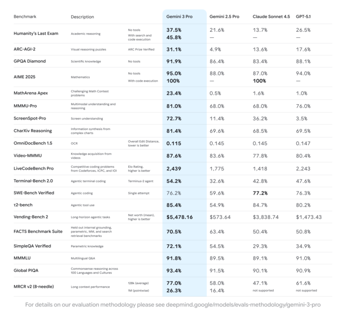 Gemini 3 Proは20項目のベンチマークのうち18項目でトップスコアを記録。特にMathArena Apex(23.4%)、ScreenSpot-Pro(72.7%)、ARC-AGI-2(31.1%)などで他モデルを大きく引き離した