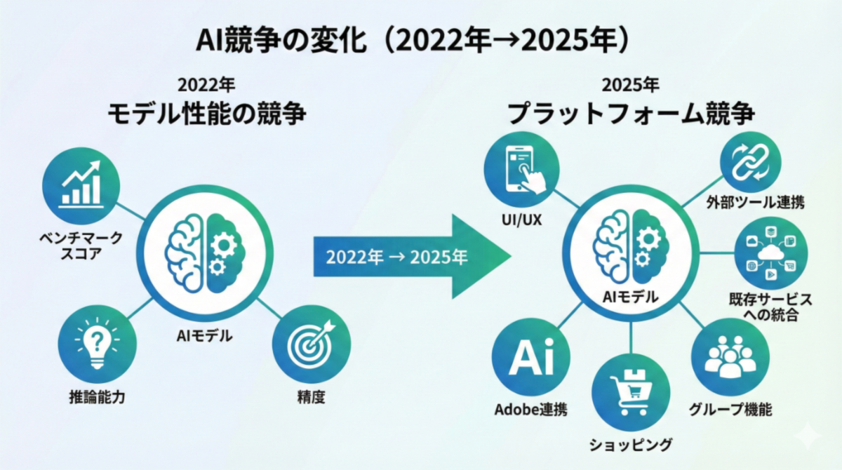 これまでの競争は、主にモデル性能(ベンチマークスコア、推論能力、精度)で勝負が決まっていた。しかし現在は、グーグルの巨大なユーザーベース(検索、Gmail、YouTube、Androidなど)への組み込み、Anthropicの企業向け安全性重視戦略、そしてOpenAIの機能拡張(グループチャット、ショッピング、Adobe連携など)といった「プラットフォーム競争」に移行している。