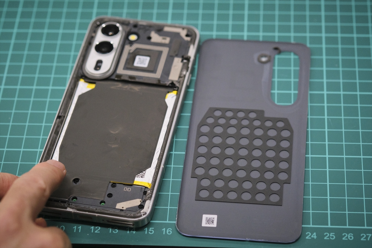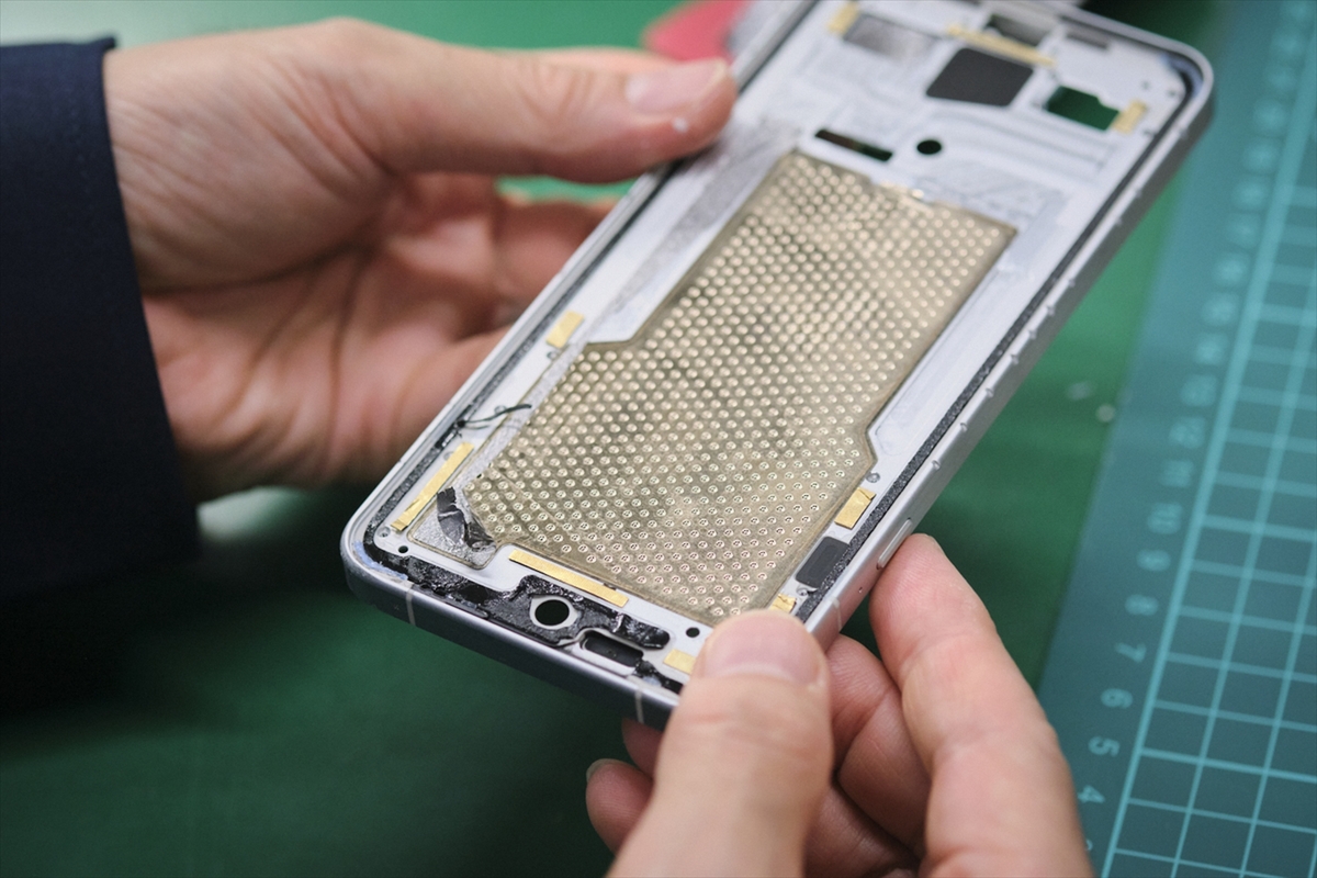 背面パネルをはじめ、筐体の接合部には、防水仕様の特殊な接着剤(粘着剤)が使われています。この粘着剤は、水分の侵入を防ぐだけでなく、落下による衝撃でパネルが剥がれるのを防ぐ役割も担っており、バランスを考慮して約100種類近くの素材をテストしたそうです。