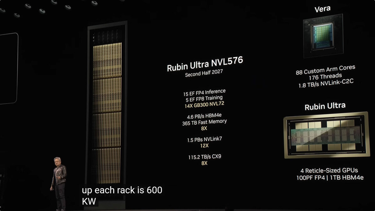 今回はNVIDIAのGB200/GB300を使ったNVL72ラックソリューションである。今年後半に入って、データセンターのラックに熱い注目が集まっている。直接的なきっかけは今年3月に開催されたGTCにおいて、2027年後半に投入されるKyberラックを利用したRubin UltraベースのNVL576というラックソリューションの消費電力が、ラックあたり600kWに達することが明らかにされたためだ。