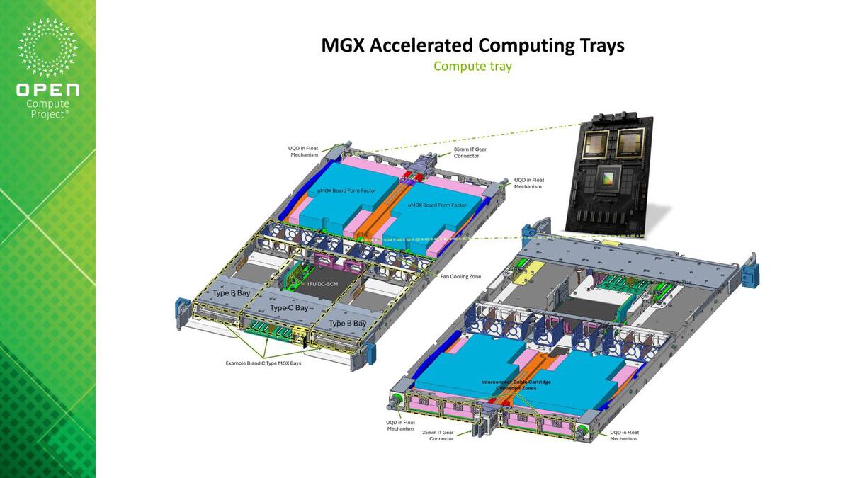 ちなみにこのスライドにOCP(Open Compute Project)のロゴがあるのは、このCompute Trayの物理形状がOCPで定める"MGX Accelerated Computing Rack and Trays Specification"という仕様に準拠しているためである。というより、MGXの仕様そのものはNVIDIAが策定し、これをOCPに寄贈した形で標準化されている。