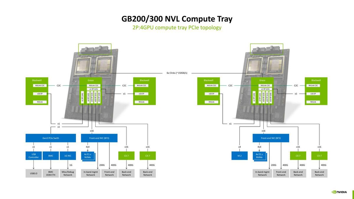 前提になるのは全体の構成である。GB200の構成は連載765回でも説明しているが、GB200×2とGraceが搭載されたGB200 Grace Blackwell Superchipが2枚、1つのCompute Trayに搭載される。