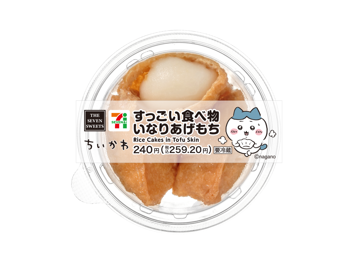 ハチワレがちいかわに「共有」したかった、すっごい食べ物の「いなりあげもち」をイメージした商品。コシのあるおもちを甘辛く煮た油揚げで包んでいる。