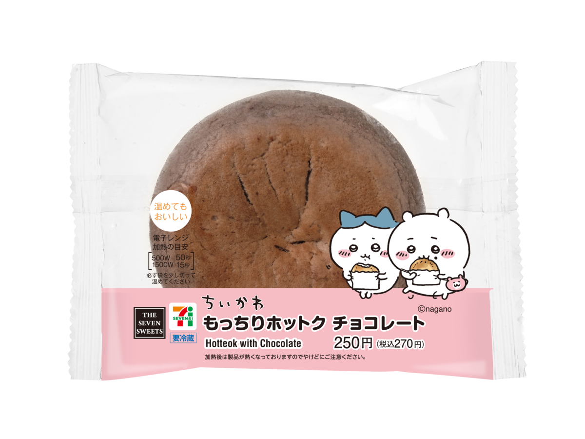 ちいかわとリボンをなくしてしまったハチワレが食べていたおやきをイメージした商品。ビターな味わいのチョコレートが入ったもちもち食感のホットク。