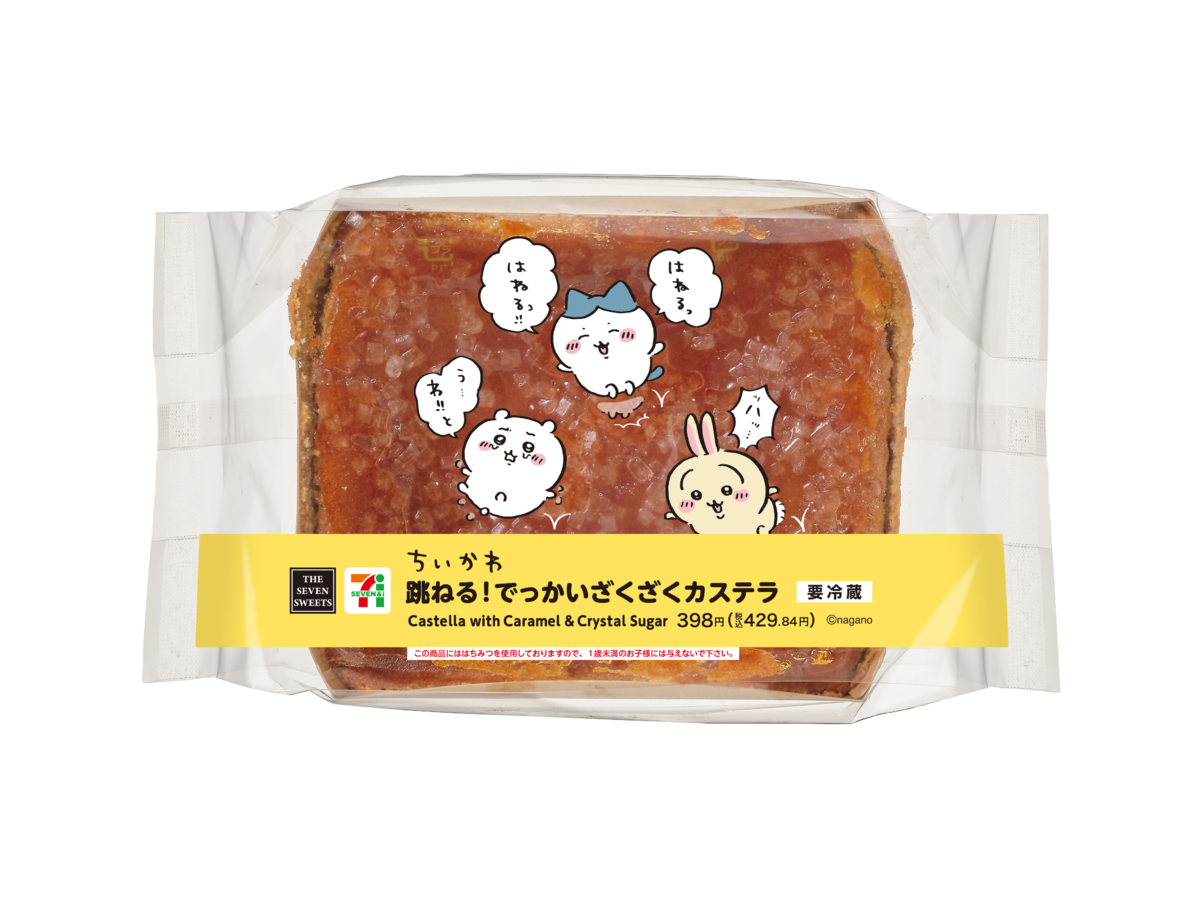 ちいかわたちが飛び跳ねていたザラメ付きカステラをイメージした商品。ザラメのざくざく食感としっとりとした生地のコントラストが楽しめる。