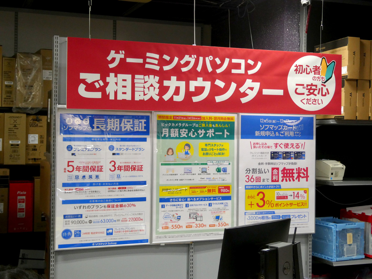 いまなら先着100名にSSD 1TBを5000円で提供する特典がついている(現在の通常価格は2万円程度)。ソフマップ AKIBA パソコン・デジタル館には初心者にも安心のゲーミングパソコン相談カウンターが設置されているので、予算からモデルを選んだり、必要スペックからCPUやGPUを選ぶアドバイスをもらうことができる。