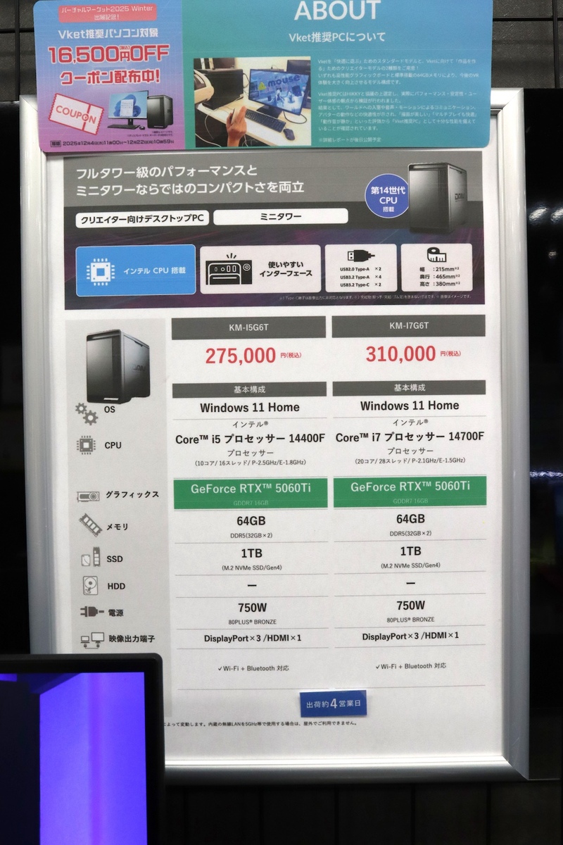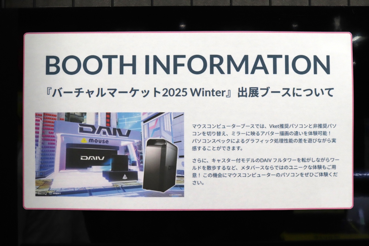 3Dアバターなどの3Dアイテムをはじめ、リアル商品も売り買いできる世界最大級のメタバースイベント「バーチャルマーケット」(以下、Vket)が、2025年12月6日〜21日の期間で開催中です。マウスコンピューターも、Vket推奨パソコンの性能を疑似的に体験できるブースを出展しており、その場でVket推奨パソコンを購入することもできます。