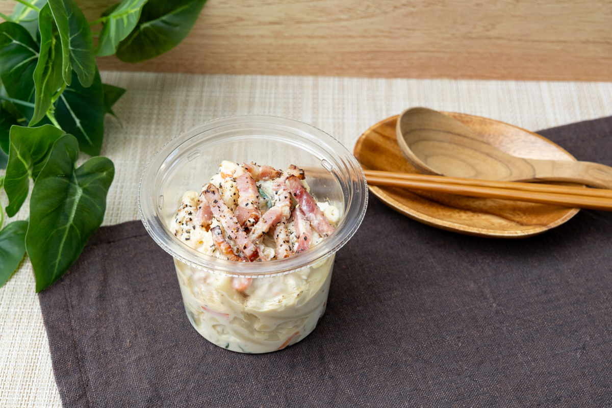 マカロニサラダにベーコンとブラックペッパーを組み合わせた商品で、重量は通常品の約1.8倍です。
