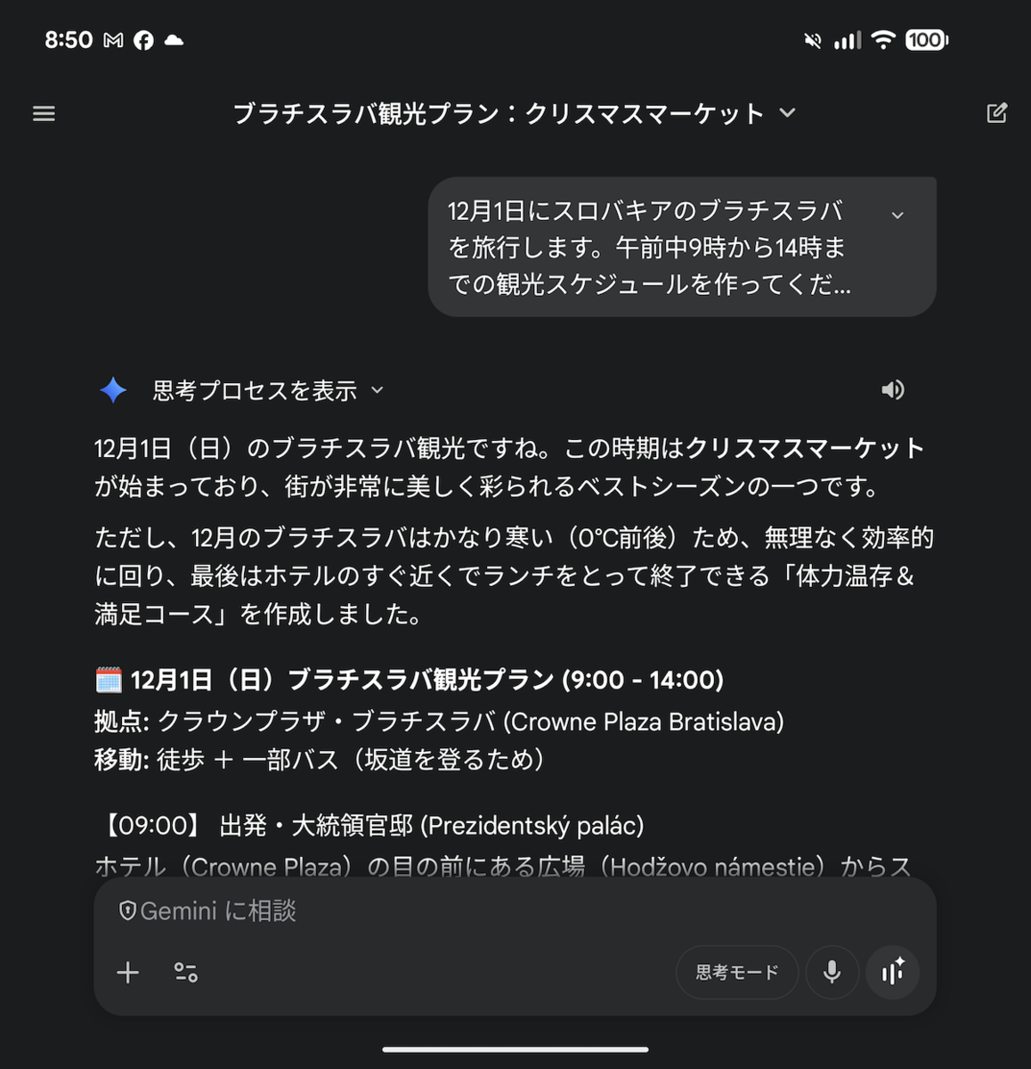 取材でスロバキアの首都、ブラチスラバを訪問しました。半日ほど観光する時間ができたのですが、ブラチスラバは以前、ドナウ川を移動中に停泊はしたものの、初訪問の土地。初めて訪れる都市での「土地勘のなさ」は、ワクワクすると同時に少し不安な要素でもあります。そこで今回は、あえて何も調べず、最新のAIアシスタント「Gemini」に観光プランを丸投げしてみることにしました。