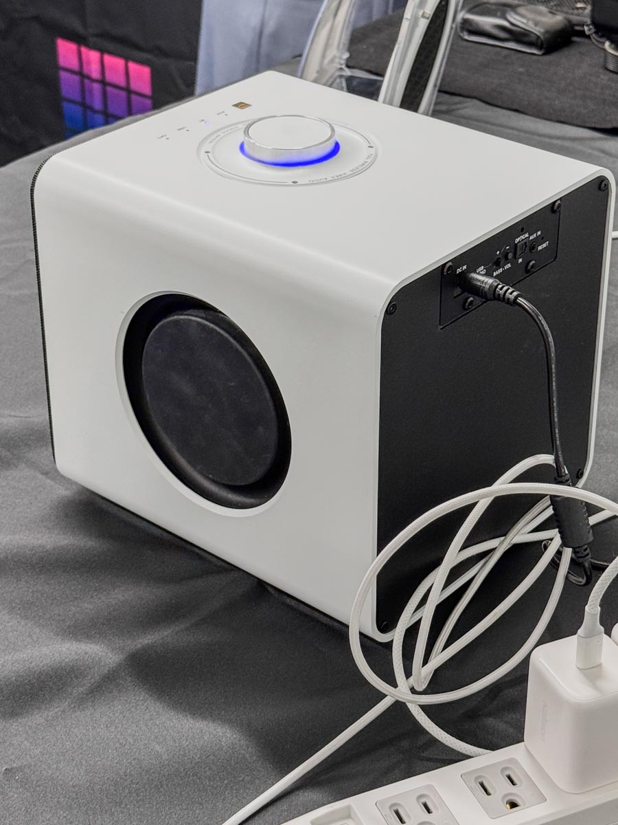 機能面ではBluetooth接続(LDAC対応予定)を基本とし、スピーカー同士もワイヤレス接続され、電源ケーブルのみで設置が可能だ。また、USB、光デジタル、3.5mmアナログ入力も備えている。本製品はGREEN FUNDINGでの先行販売を経て、市場投入する計画。これに先行して渋谷にあるTSUTAYAのポップアップスペースや、二子玉川の蔦屋家電(12月23日以降)での展示も予定されている。正式な発売は3月になり、価格は24万8000円となる見込み。
