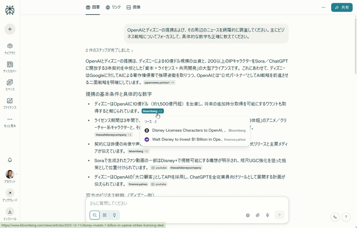 ここでは、先日ニュースになったOpenAIとディズニーの提携について検索してみよう。あっという間に検索し、最新情報を教えてくれる。