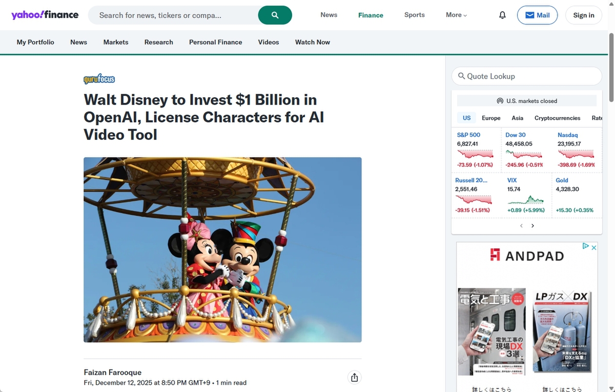 ウォルト・ディズニー、OpenAIに10億ドル出資 動画生成「Sora」でミッキー等が利用可能に