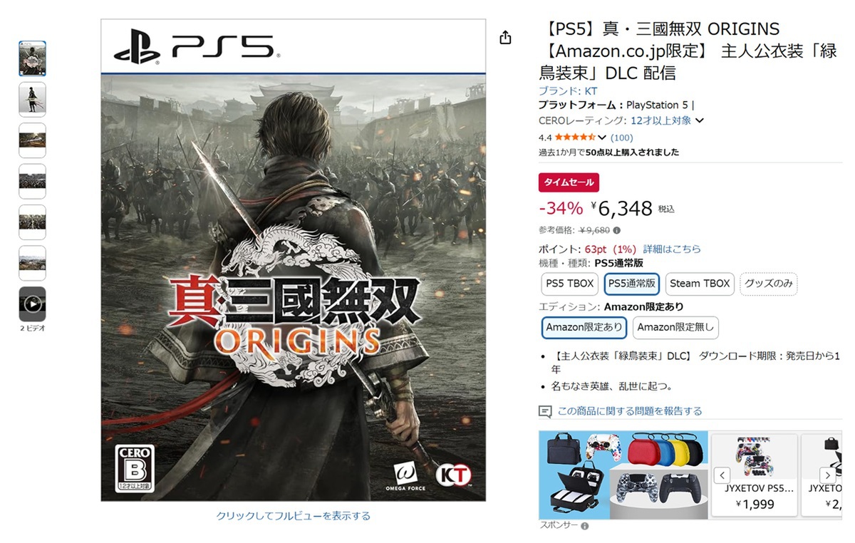 Amazon.co.jpにて、コーエーテクモゲームスのPlayStation 5版「真・三國無双 ORIGINS」がタイムセールの対象になっている。いまだけ34%オフの6348円で購入できるのでお見逃しなく。