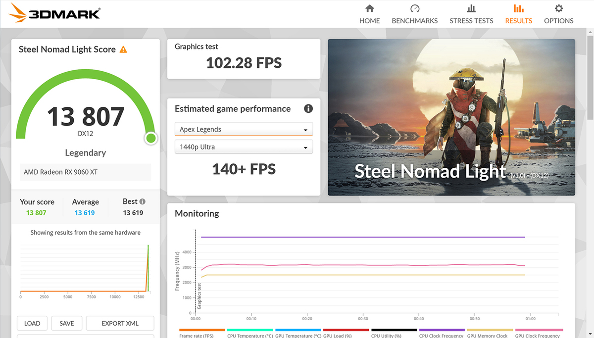 すると、総合スコアは13807を記録し、Graphics test(フレームレート)は余裕のある102.28fpsまで伸びた。「Apex Legends」をターゲットにしたパフォーマンス指標では、2560×1440ドットで140fps超えを記録した。快適なプレイの基準となる60fpsは余裕でクリアし、その倍近くのフレームレートを叩き出しているため、文句のつけようがない。