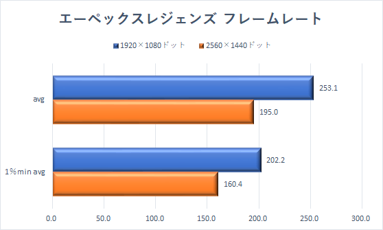 プレイしたタイトルのなかで、最もビデオカードへの負荷が低い「エーペックスレジェンズ」からみていこう。解像度はターゲットの1920×1080ドットと、2560×1440ドットの2種類に固定した。グラフィック品質はプリセットがないため、最も高くなるように設定した。