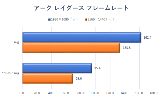 解像度は、ここまでと同じ2種類で、フレームレートの計測には、ゲーム内ベンチマーク機能を使用し、リザルトの「平均FPS(avg)」と「下位1%(1%min)」をまとめた。