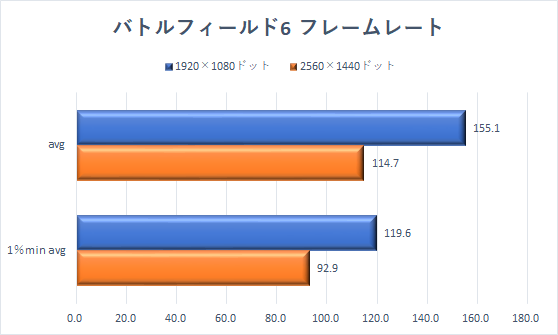解像度1920×1080ドットなら、最高画質でのプレイを楽しめるフレームレートになっている。そして画質を1段落としたプリセット「高」に設定することで、2560×1440ドットでもスムーズにプレイできる。