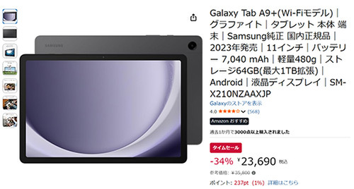 Samsung純正のAndroidタブレット「Galaxy Tab A9+(Wi-Fiモデル)」が、Amazonタイムセールに登場しました。参考価格35,800円のところ、34%オフの23,690円で販売されています。