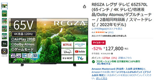REGZAの65インチ4K倍速パネル液晶テレビ「65Z570L」が、Amazonセールに登場しました。参考価格264,000円のところ、52%オフの127,800円で購入できます。