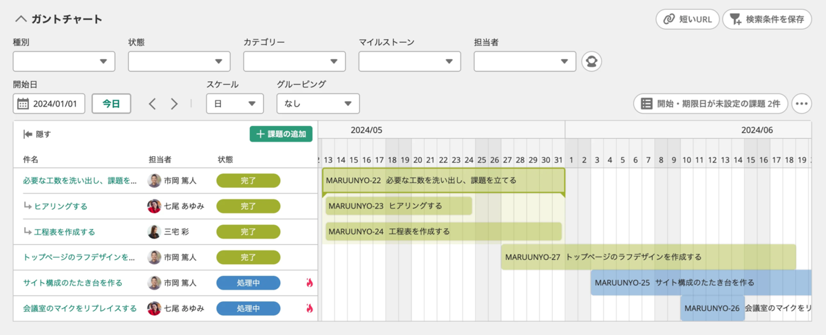 あとから「マニュアル作成」のようなタスクが発生したら、同じく課題として追加し、担当者と期限日を設定しておく。プロジェクトマネージャーやリーダーは、ガントチャートやボードでプロジェクトの全体を把握できるし、担当で課題をソートすれば、それぞれの負荷や期限日も一望できる。進捗会議で全体の進み具合を確認しつつ、新たなタスクが顕在化したら、それを起票して、対応を進めていけばよい。