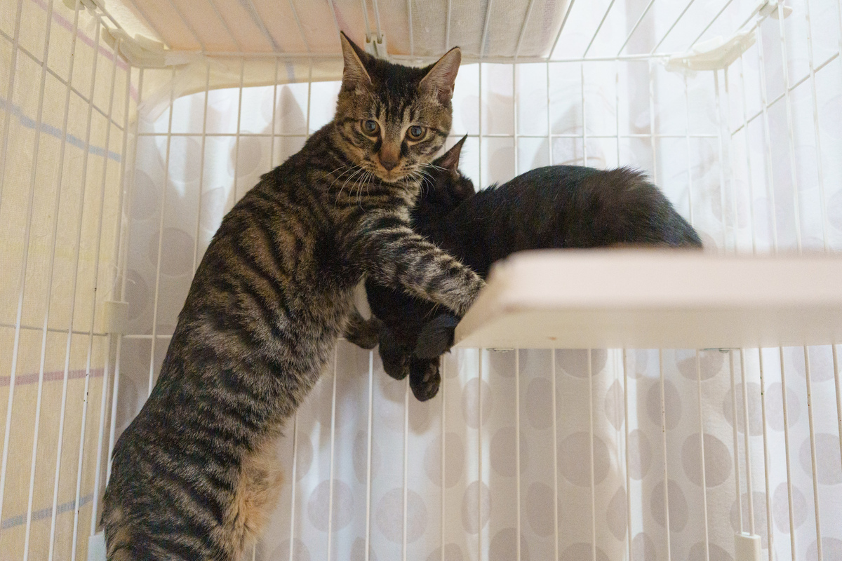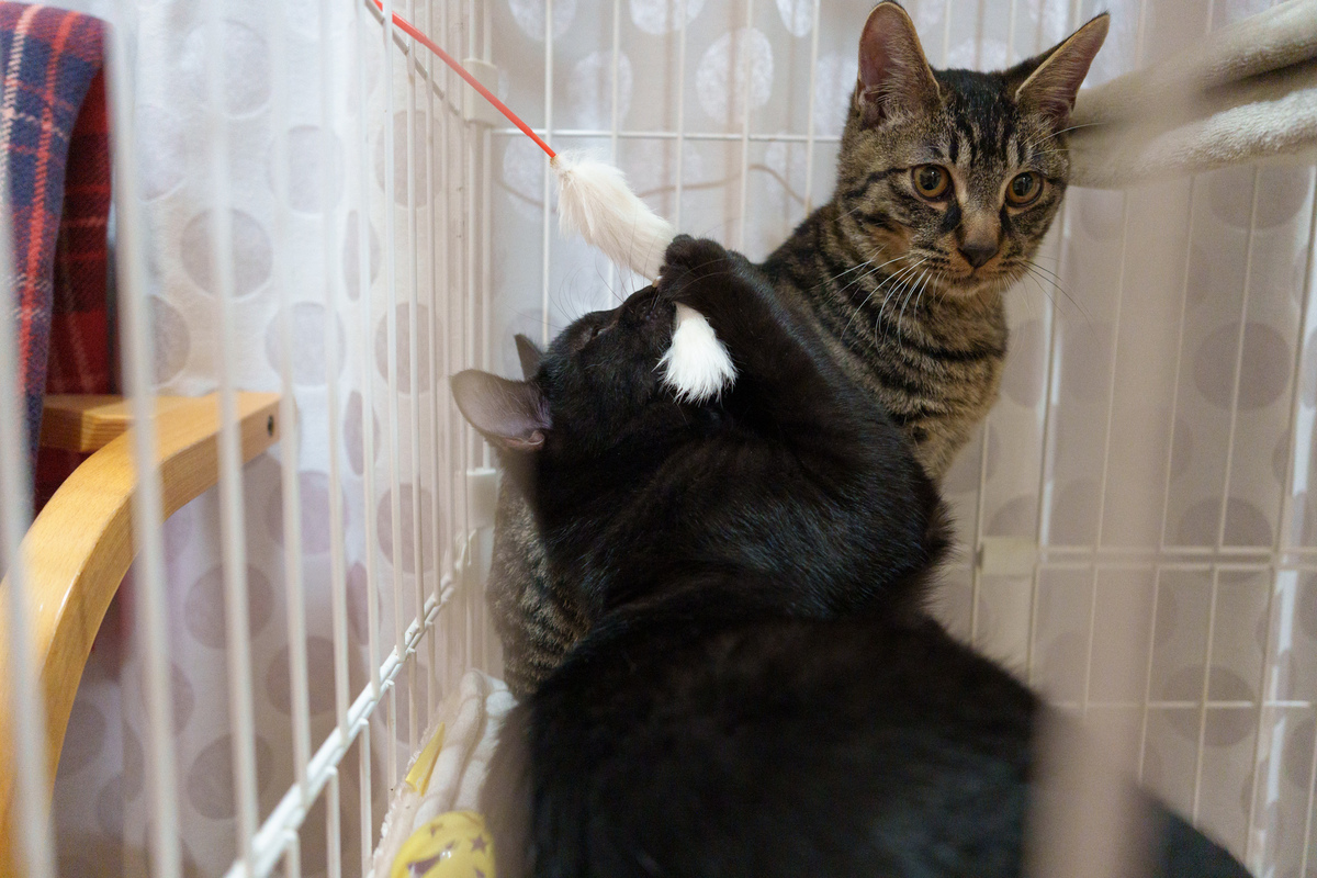 猫たちも兄弟一緒で安心してるのか、いい感じである。だがしかし、人なつこく、ケージに手を入れると自由に撫でさせてくれるのだが、いざ猫ボランティアの2人が帰ると、知らない場所で見知らぬ人間しかいない、いったいどういうことだ? って顔になって、隅っこに引っ込んで動かなくなってしまった。