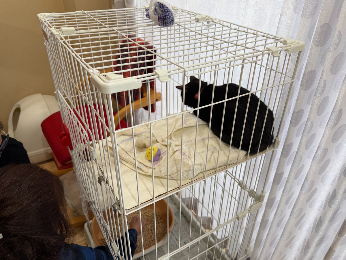 冒頭写真もそのときのもの。ちょっと慣れたら今度はケージから出してくれとばかりに鳴き始める。でも、ここで出しては大変なことになるのがわかってる。確実にどこかへ隠れようとし、あらぬところに潜り込んで見つからなくなるのだ。