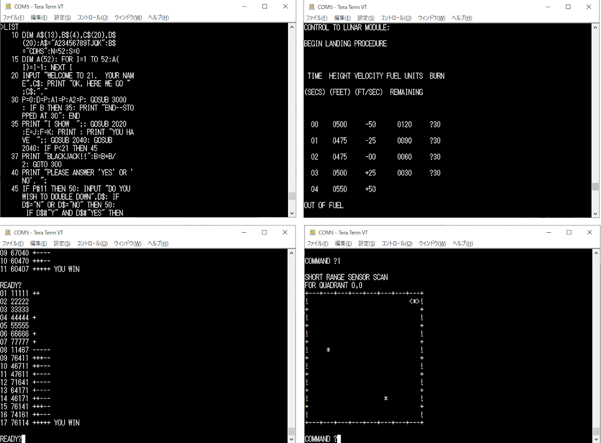 ERIS6502で試せるプログラムの画面の数々。左上から時計まわりに「BlackJack」、「Lunar Lander」、「Mastermind」、「Mini Startrek」。しかし、ここはやっぱり自分でプログラムを書いて動かしたいものだ。