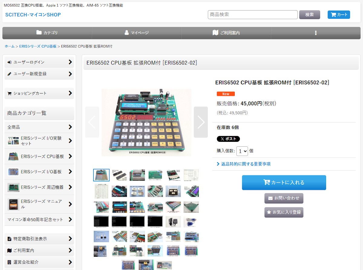 ERIS6502のほかに、以前このクラムでも紹介したERIS6800や周辺機器など関連製品もあるほか、製品の解説文を読むのも楽しい。ERIS6502が販売されているSCITECH-マイコンSHOPのページ。