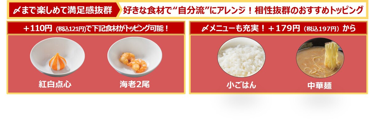 追加できるトッピングは全4種類。「紅白点心」や「海老」など具材の倍増に加えて、「中華麺」や「小ごはん」など“がっつり”アレンジも可能。