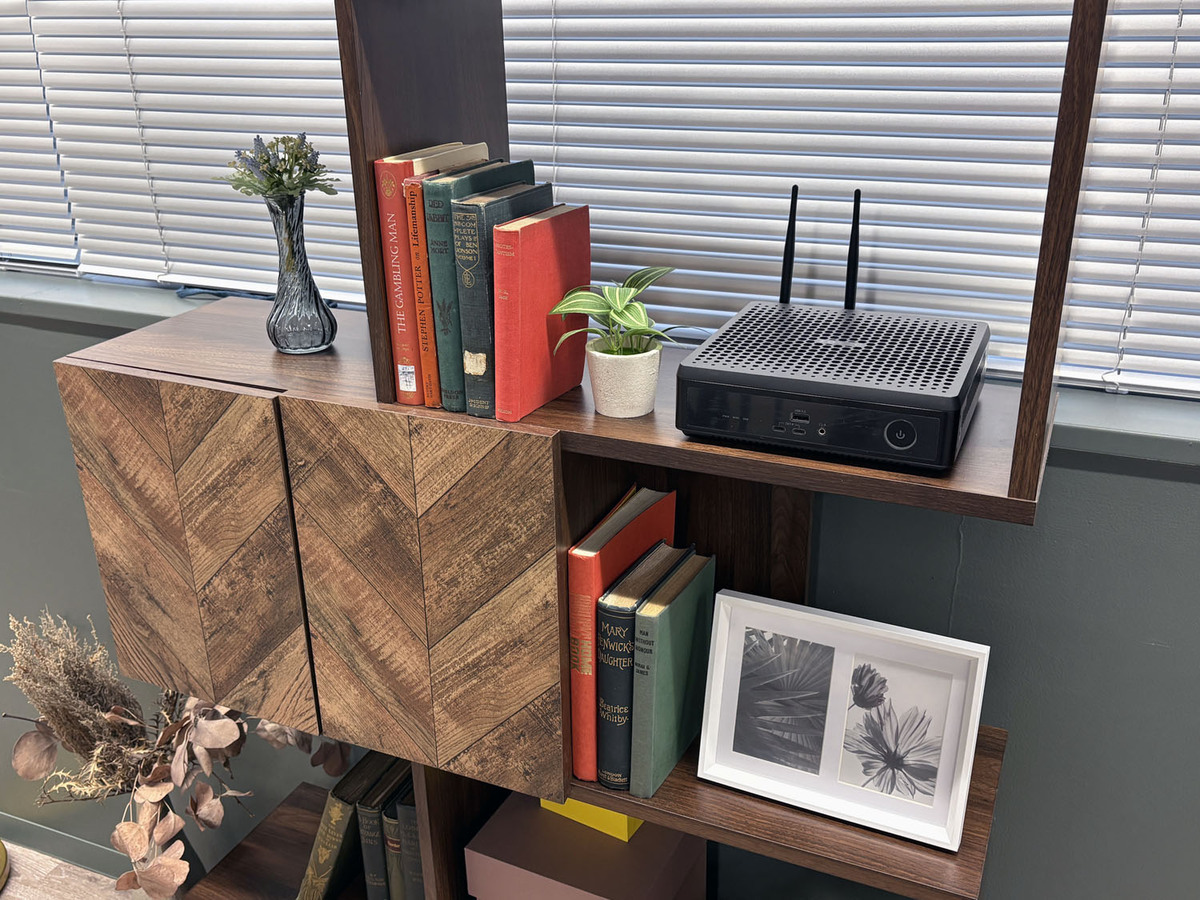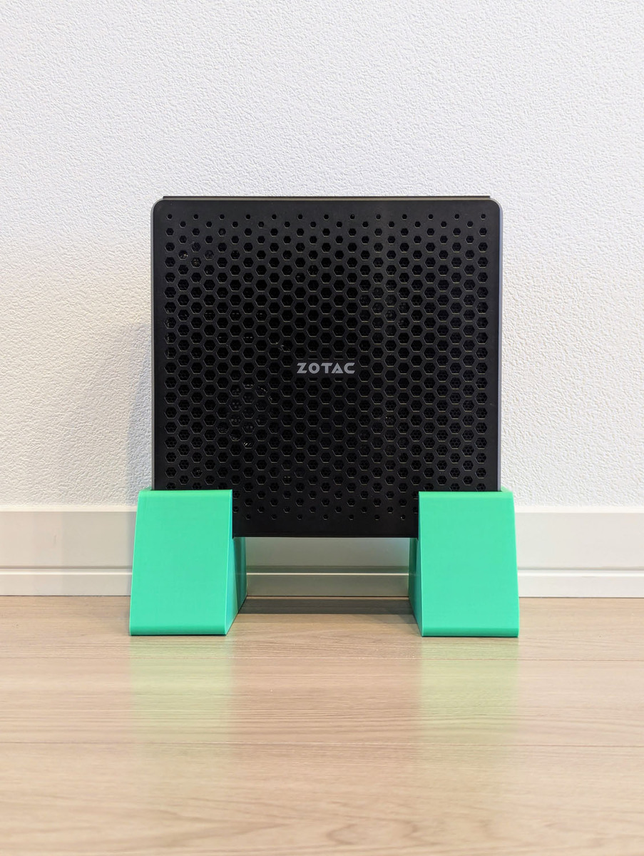 まずは壁掛けと同様、上面にある「ZOTAC」のロゴが見える向きでの縦置きスタイルだ。気を付けたのは、排気口をふさがないこと、ネジで固定できること、電源ボタンを押せるようにすることの3点だ。